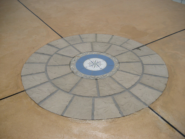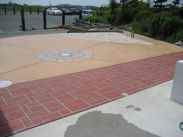 グランドコンクリート(ステンシル仕上げ及びカラー仕上げ)の中にキーツサークルを配置し真ん中に方位タイルを施工しました。そしてドラフタイト目地が東西南北にのびております。また、道路側階段は自然石の石貼りとなっており同じ石が花壇の後まで配置されたデザインとなっております。